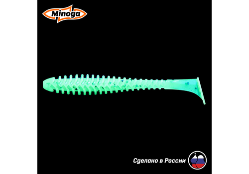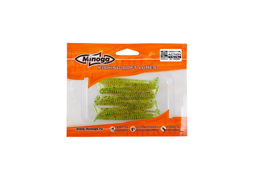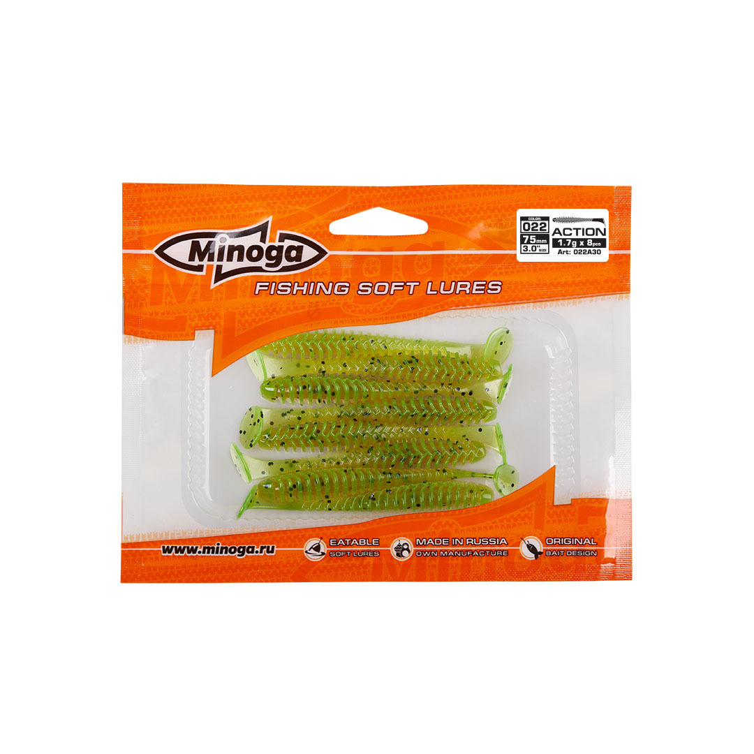 Виброхвост Minoga ACTION имеет удлиненное ребристое тело, которое создает шумы в водной среде, заставляя тем самым, обратить на себя внимание любому, даже самого пассивному хищнику. Приманка работает даже при самой медленной проводке! Action делается, как и все приманки MINOGA из мягкого съедобного силикона, с содержанием как вкусовой, так и ароматической добавки. Основным объектом ловли на данную приманку является окунь, судак и щука.  Эту приманку можно использовать на всех типах джиговых монтажей такие как: Джиг-головка, Шарнирный монтаж с разборной чебурашкой, Поводковые оснастки, Джиг-риг, Дроп-шот итд.