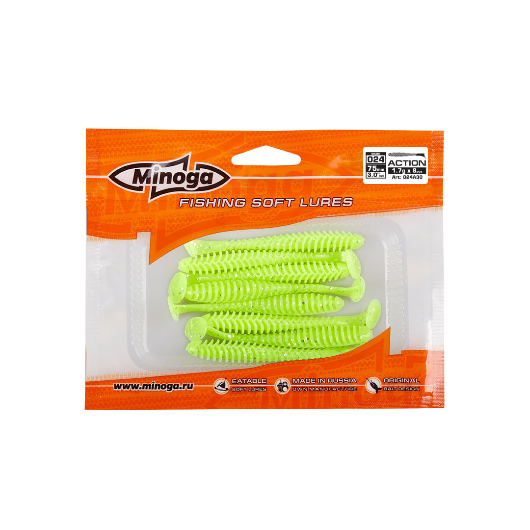 Виброхвост Minoga ACTION имеет удлиненное ребристое тело, которое создает шумы в водной среде, заставляя тем самым, обратить на себя внимание любому, даже самого пассивному хищнику. Приманка работает даже при самой медленной проводке! Action делается, как и все приманки MINOGA из мягкого съедобного силикона, с содержанием как вкусовой, так и ароматической добавки. Основным объектом ловли на данную приманку является окунь, судак и щука.  Эту приманку можно использовать на всех типах джиговых монтажей такие как: Джиг-головка, Шарнирный монтаж с разборной чебурашкой, Поводковые оснастки, Джиг-риг, Дроп-шот итд.