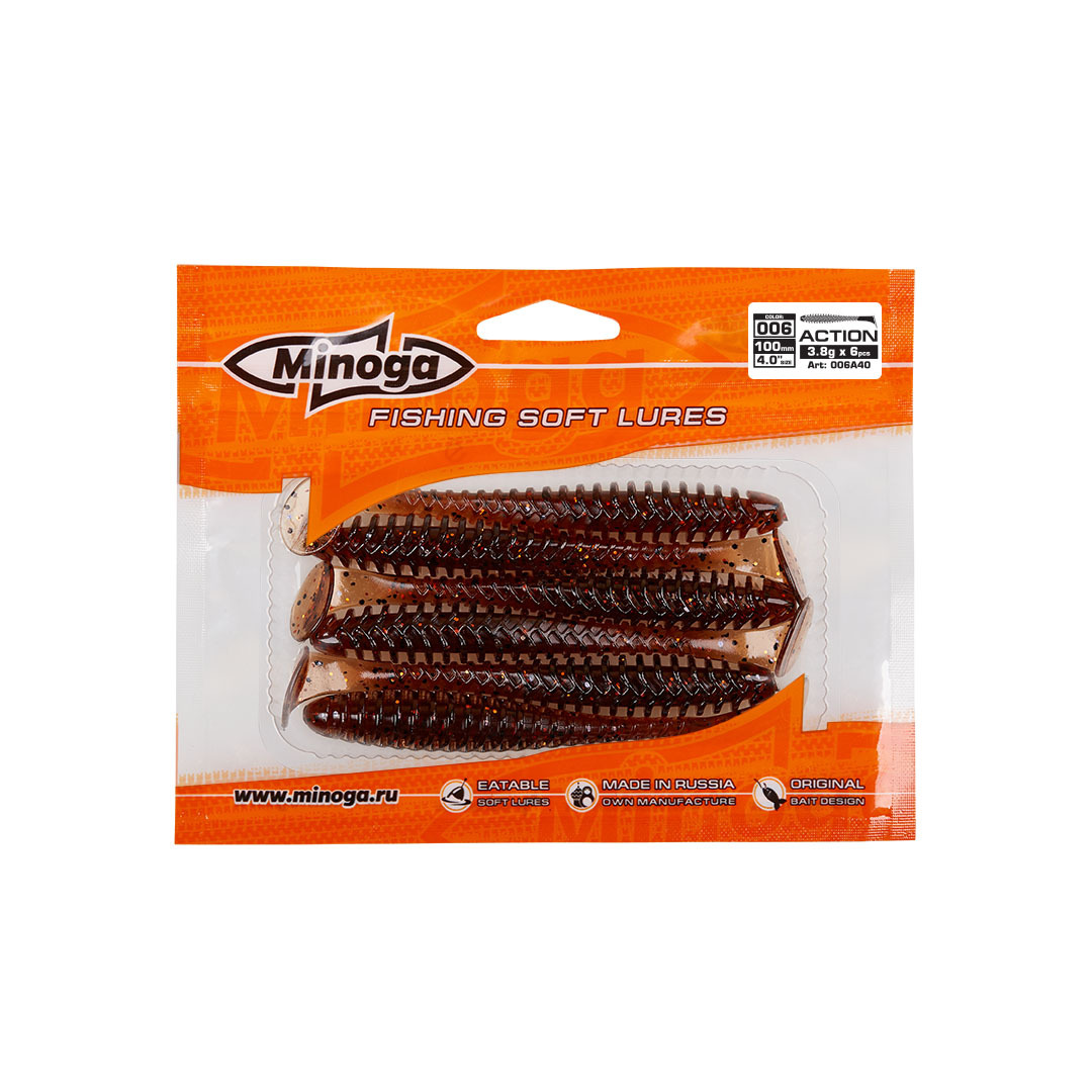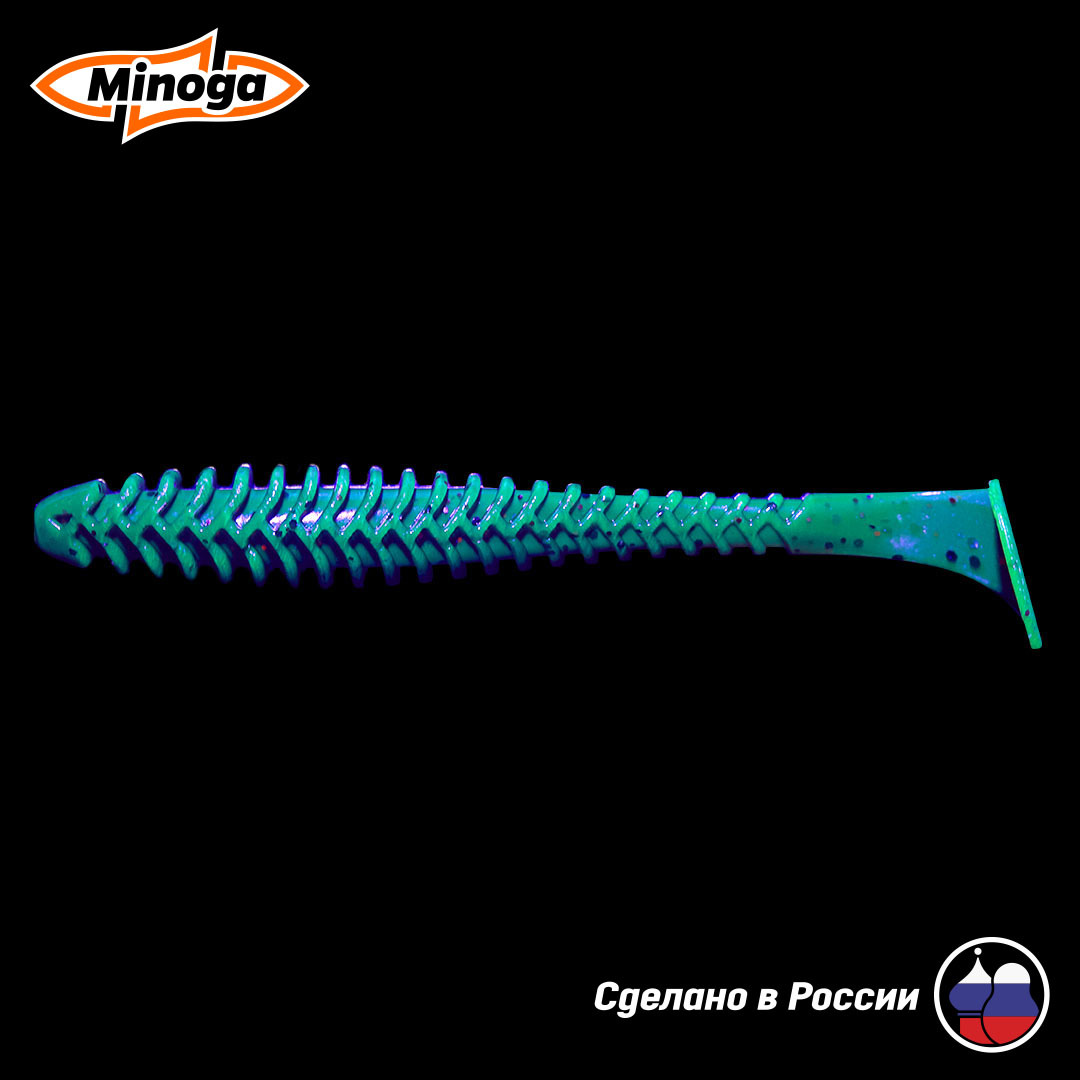 Виброхвост Minoga ACTION имеет удлиненное ребристое тело, которое создает шумы в водной среде, заставляя тем самым, обратить на себя внимание любому, даже самого пассивному хищнику. Приманка работает даже при самой медленной проводке! Action делается, как и все приманки MINOGA из мягкого съедобного силикона, с содержанием как вкусовой, так и ароматической добавки. Основным объектом ловли на данную приманку является окунь, судак и щука.  Эту приманку можно использовать на всех типах джиговых монтажей такие как: Джиг-головка, Шарнирный монтаж с разборной чебурашкой, Поводковые оснастки, Джиг-риг, Дроп-шот итд.
