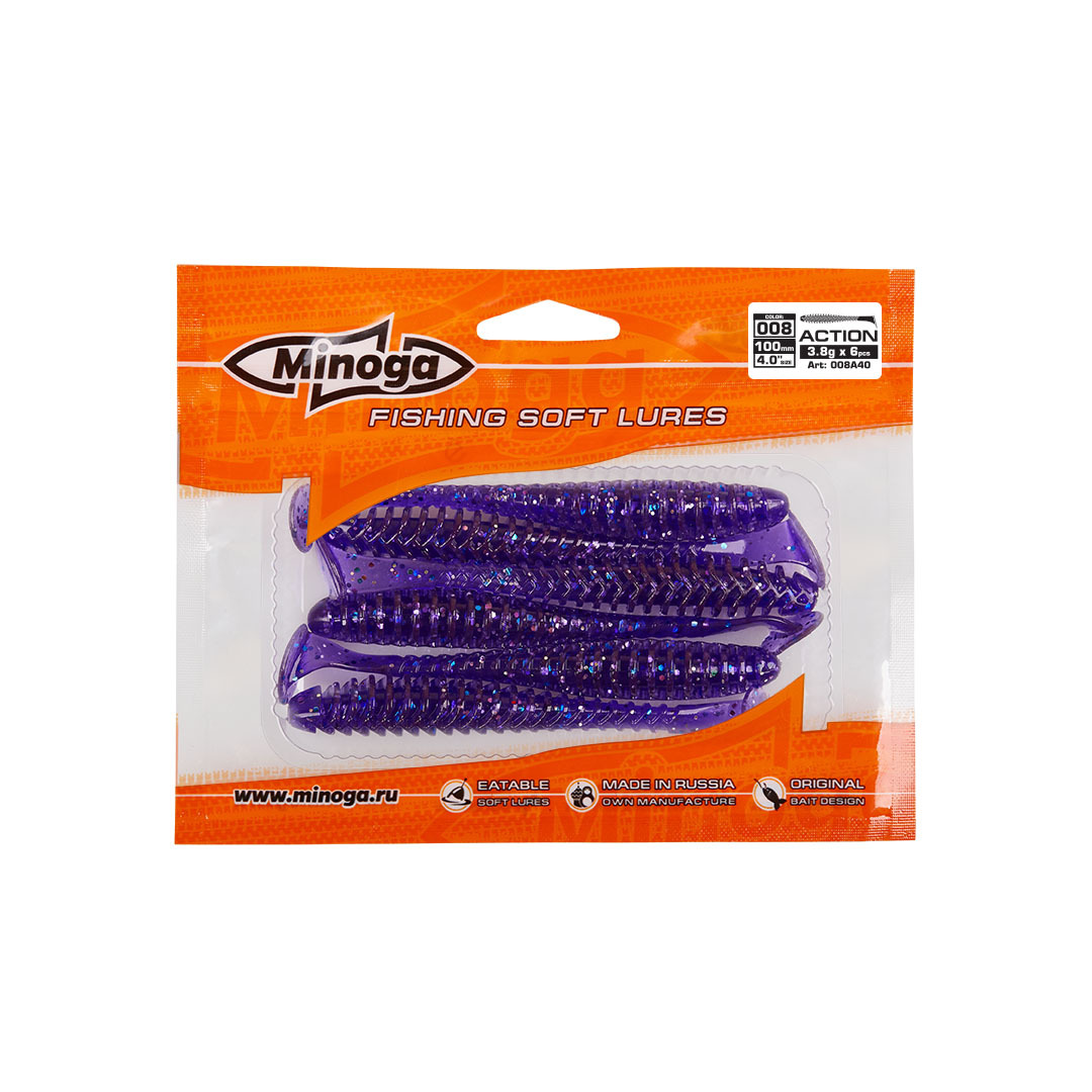 Виброхвост Minoga ACTION имеет удлиненное ребристое тело, которое создает шумы в водной среде, заставляя тем самым, обратить на себя внимание любому, даже самого пассивному хищнику. Приманка работает даже при самой медленной проводке! Action делается, как и все приманки MINOGA из мягкого съедобного силикона, с содержанием как вкусовой, так и ароматической добавки. Основным объектом ловли на данную приманку является окунь, судак и щука.  Эту приманку можно использовать на всех типах джиговых монтажей такие как: Джиг-головка, Шарнирный монтаж с разборной чебурашкой, Поводковые оснастки, Джиг-риг, Дроп-шот итд.