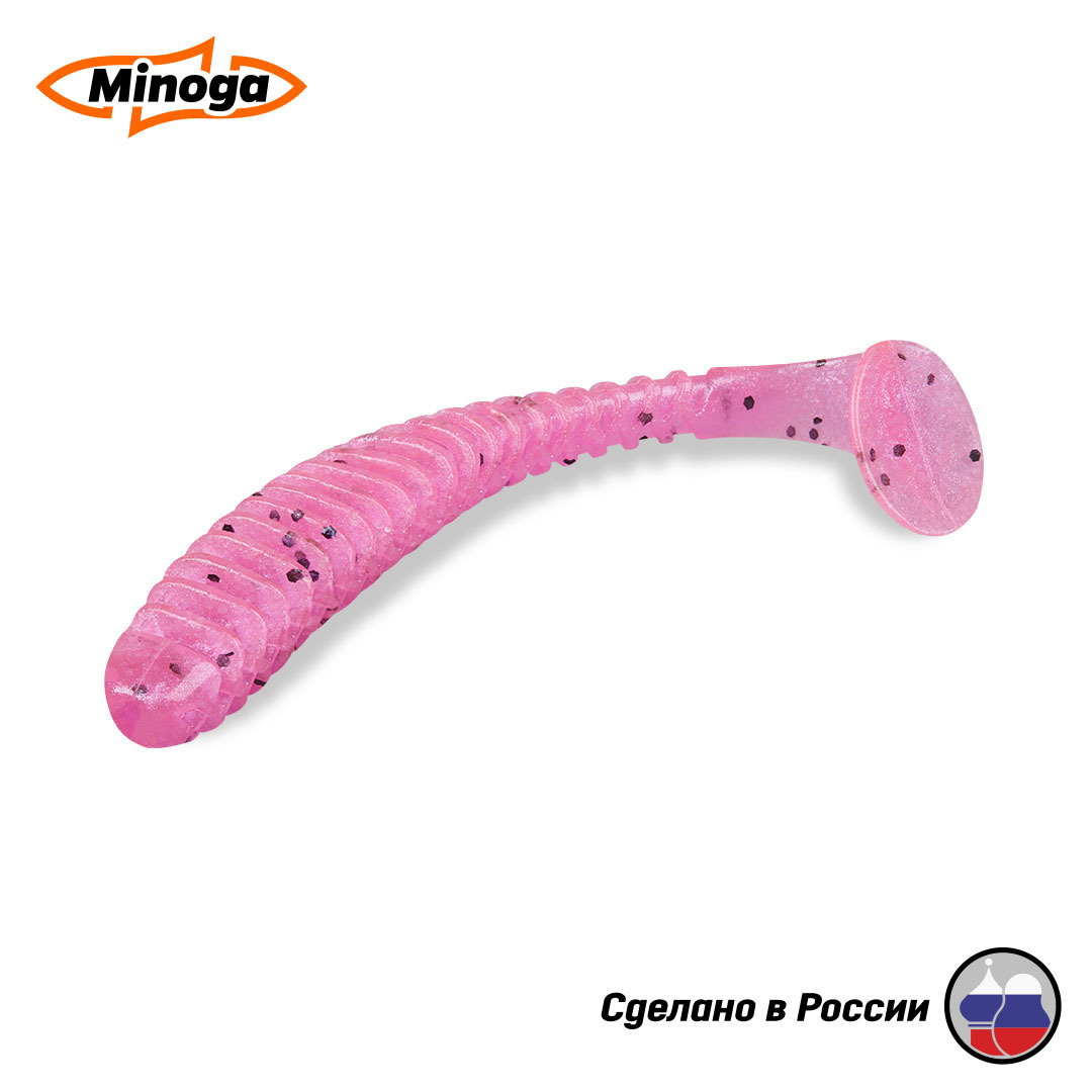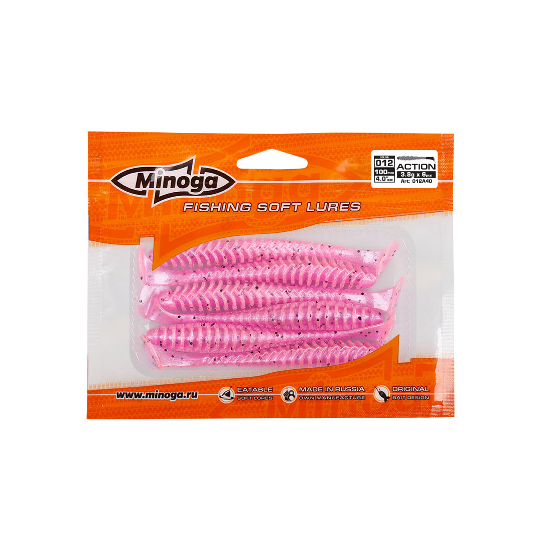Виброхвост Minoga ACTION имеет удлиненное ребристое тело, которое создает шумы в водной среде, заставляя тем самым, обратить на себя внимание любому, даже самого пассивному хищнику. Приманка работает даже при самой медленной проводке! Action делается, как и все приманки MINOGA из мягкого съедобного силикона, с содержанием как вкусовой, так и ароматической добавки. Основным объектом ловли на данную приманку является окунь, судак и щука.  Эту приманку можно использовать на всех типах джиговых монтажей такие как: Джиг-головка, Шарнирный монтаж с разборной чебурашкой, Поводковые оснастки, Джиг-риг, Дроп-шот итд.