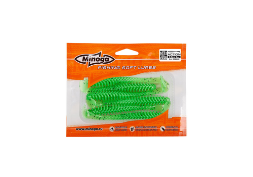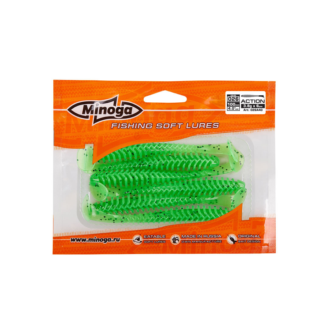 Виброхвост Minoga ACTION имеет удлиненное ребристое тело, которое создает шумы в водной среде, заставляя тем самым, обратить на себя внимание любому, даже самого пассивному хищнику. Приманка работает даже при самой медленной проводке! Action делается, как и все приманки MINOGA из мягкого съедобного силикона, с содержанием как вкусовой, так и ароматической добавки. Основным объектом ловли на данную приманку является окунь, судак и щука.  Эту приманку можно использовать на всех типах джиговых монтажей такие как: Джиг-головка, Шарнирный монтаж с разборной чебурашкой, Поводковые оснастки, Джиг-риг, Дроп-шот итд.