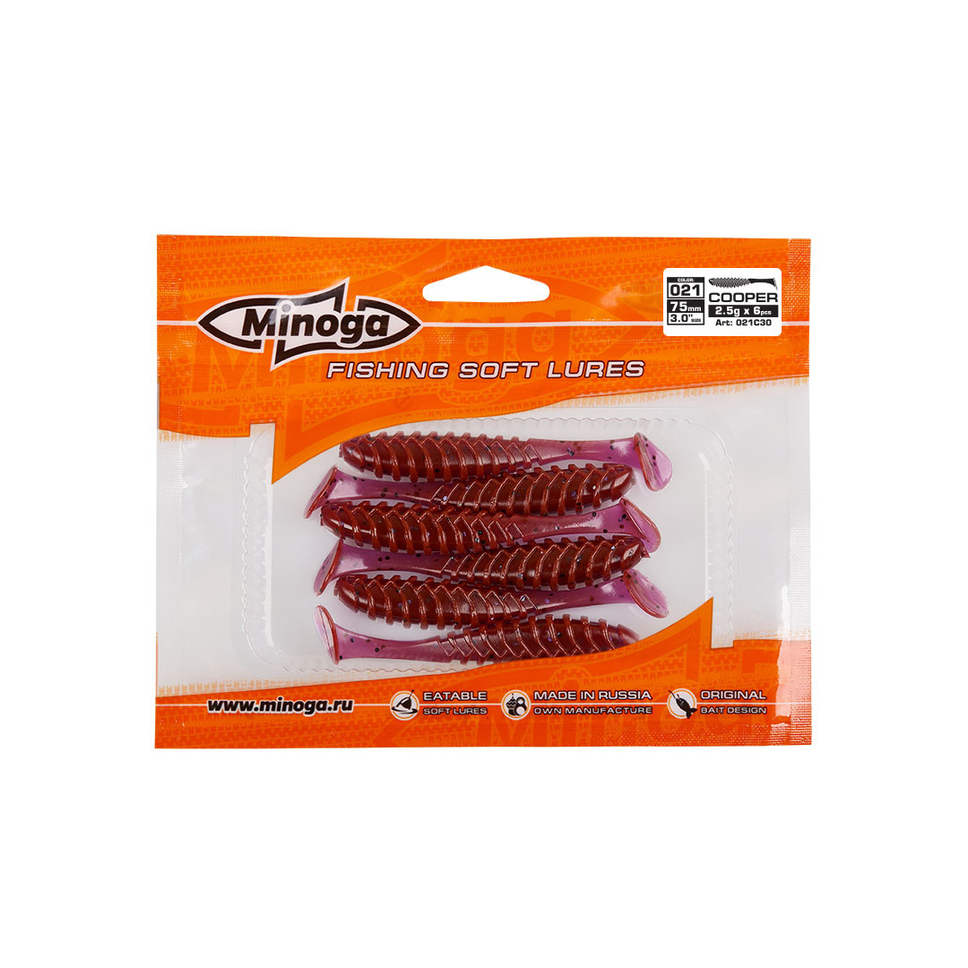 Виброхвост Minoga COOPER имеет удлиненное ребристое треугольное тело, которое создает шумы в водной среде, заставляя тем самым, обратить на себя внимание любому, даже самого пассивному хищнику. Отлично монтируется на офсетный, двойной или одинарный крючок. Приманка работает даже при самой медленной проводке! Cooper делается, как и все приманки MINOGA из мягкого съедобного силикона, с содержанием как вкусовой, так и ароматической добавки. Основным объектом ловли на данную приманку является окунь, судак и щука.