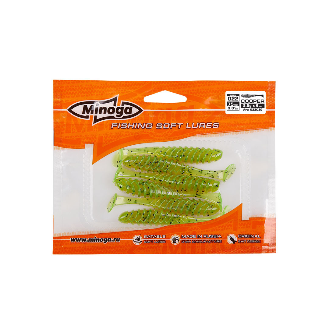 Виброхвост Minoga COOPER имеет удлиненное ребристое треугольное тело, которое создает шумы в водной среде, заставляя тем самым, обратить на себя внимание любому, даже самого пассивному хищнику. Отлично монтируется на офсетный, двойной или одинарный крючок. Приманка работает даже при самой медленной проводке! Cooper делается, как и все приманки MINOGA из мягкого съедобного силикона, с содержанием как вкусовой, так и ароматической добавки. Основным объектом ловли на данную приманку является окунь, судак и щука.