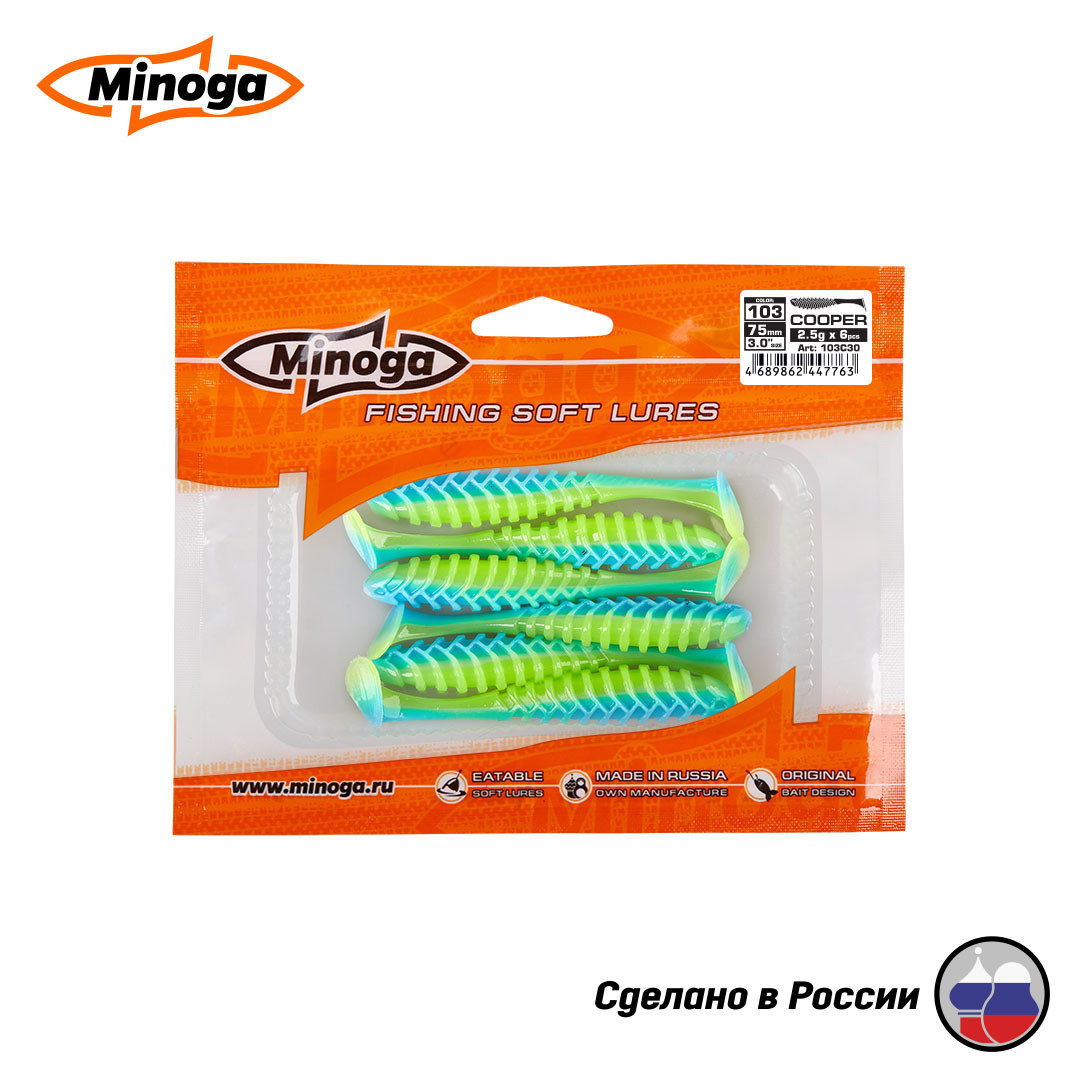 Виброхвост Minoga COOPER имеет удлиненное ребристое треугольное тело, которое создает шумы в водной среде, заставляя тем самым, обратить на себя внимание любому, даже самого пассивному хищнику. Отлично монтируется на офсетный, двойной или одинарный крючок. Приманка работает даже при самой медленной проводке! Cooper делается, как и все приманки MINOGA из мягкого съедобного силикона, с содержанием как вкусовой, так и ароматической добавки. Основным объектом ловли на данную приманку является окунь, судак и щука.