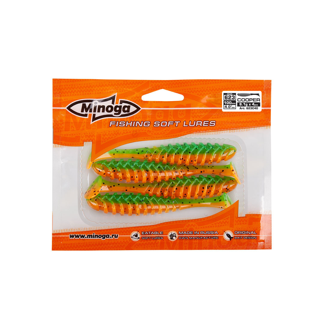 Виброхвост Minoga COOPER имеет удлиненное ребристое треугольное тело, которое создает шумы в водной среде, заставляя тем самым, обратить на себя внимание любому, даже самого пассивному хищнику. Отлично монтируется на офсетный, двойной или одинарный крючок. Приманка работает даже при самой медленной проводке! Cooper делается, как и все приманки MINOGA из мягкого съедобного силикона, с содержанием как вкусовой, так и ароматической добавки. Основным объектом ловли на данную приманку является окунь, судак и щука.