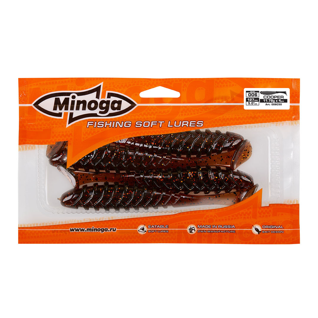 Виброхвост Minoga COOPER имеет удлиненное ребристое треугольное тело, которое создает шумы в водной среде, заставляя тем самым, обратить на себя внимание любому, даже самого пассивному хищнику. Отлично монтируется на офсетный, двойной или одинарный крючок. Приманка работает даже при самой медленной проводке! Cooper делается, как и все приманки MINOGA из мягкого съедобного силикона, с содержанием как вкусовой, так и ароматической добавки. Основным объектом ловли на данную приманку является окунь, судак и щука.