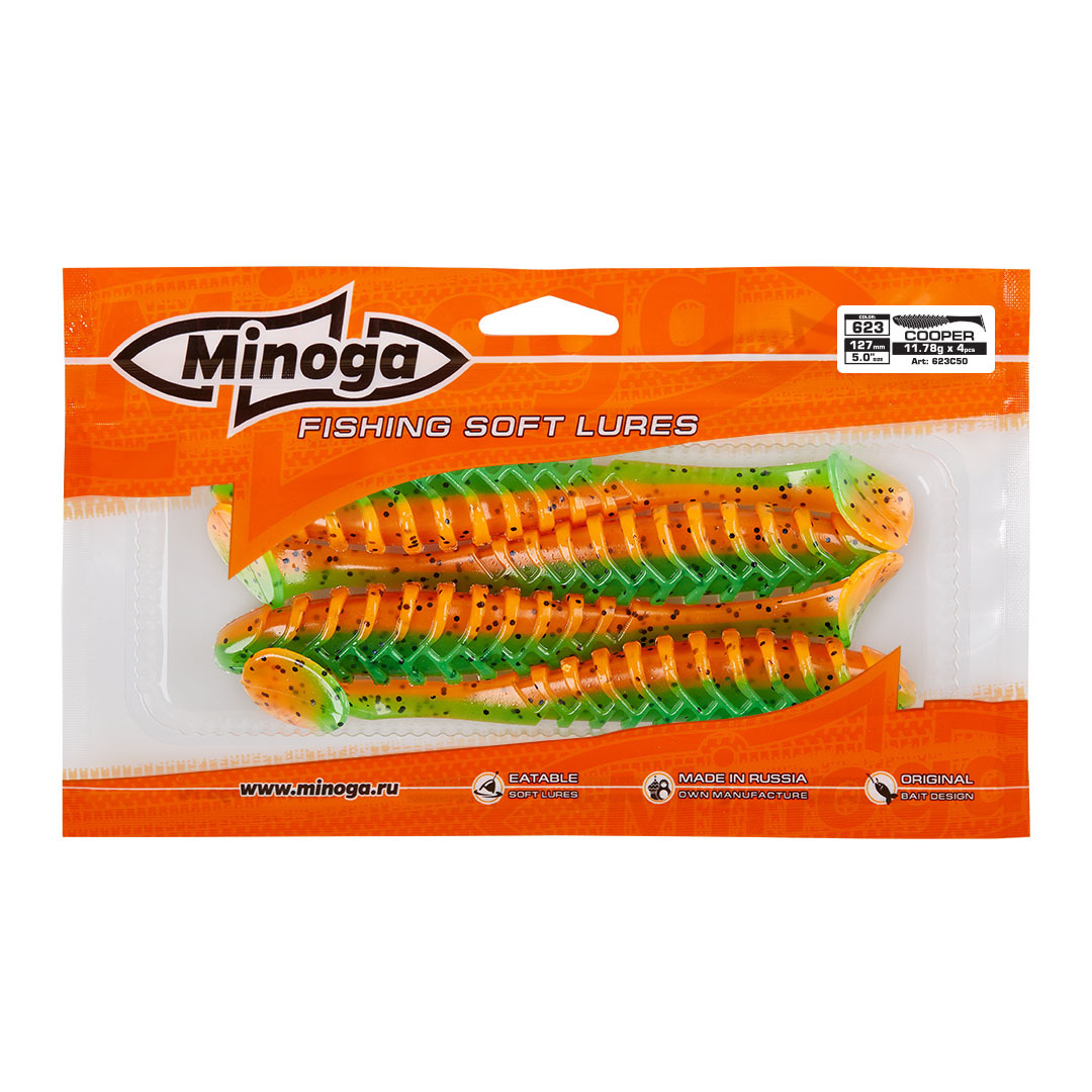 Виброхвост Minoga COOPER имеет удлиненное ребристое треугольное тело, которое создает шумы в водной среде, заставляя тем самым, обратить на себя внимание любому, даже самого пассивному хищнику. Отлично монтируется на офсетный, двойной или одинарный крючок. Приманка работает даже при самой медленной проводке! Cooper делается, как и все приманки MINOGA из мягкого съедобного силикона, с содержанием как вкусовой, так и ароматической добавки. Основным объектом ловли на данную приманку является окунь, судак и щука.