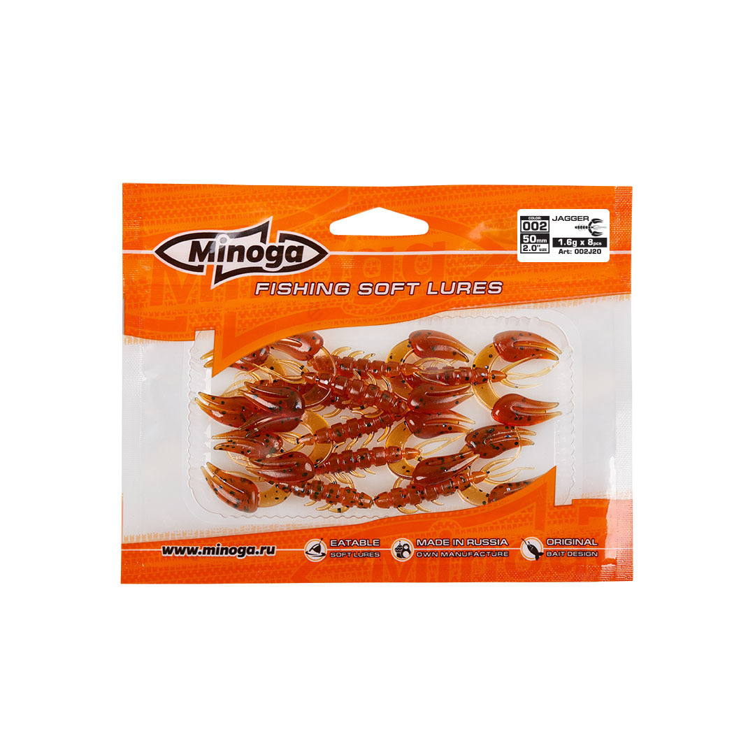 Рак Minoga Jagger имеет свою оригинальную игру клешнями, он заставит обратить на себя внимание любого, даже самого пассивного хищника. Приманка работает даже при самой медленной проводке! jagger делается, как и все приманки MINOGA из мягкого съедобного силикона, с содержанием как вкусовой, так и ароматической добавки. Основным объектом ловли на данную приманку является окунь, судак, сом и не редко щука