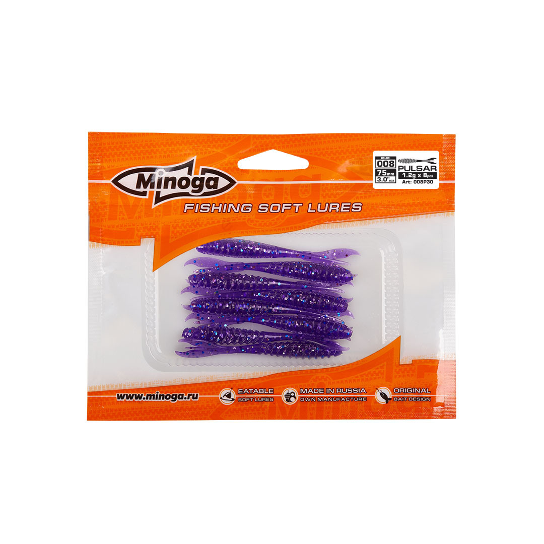 Слаг Minoga PULSAR имеет тело довольно объемное, ребристое плавно переходит в гибкий и крайне подвижный хвост, заставляя тем самым, обратить на себя внимание любого, даже самого пассивному хищника! Pulsar делается, как и все приманки MINOGA из мягкого съедобного силикона, с содержанием как вкусовой, так и ароматической добавки. Основным объектом ловли на данную приманку является окунь, судак и щука.